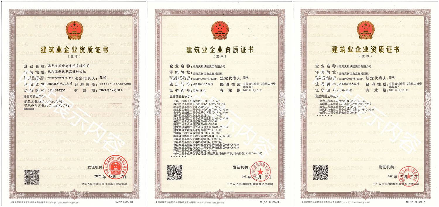 浩龍?zhí)煨浅墙瘓F有限公司,2007年成立于“李白故鄉、中國科技城”—四川省綿陽市,企業注冊資本金5.0008億元。公司共有27項建筑業企業資質,其中國家一級資質11項,二級資質10項,三級資質5項,特種資質不分等級1項,類別涵蓋建筑、市政、水利、機電、隧道、起重設備安裝等基礎及未來發(fā)展重點專業。公司下設三個辦事處,業務范圍輻射全國,在建項目三十余個,累計完成產值超11億元。公司是綿陽市建筑施工企業協會副會長單位、綿陽遂寧商會會長級單位、綿陽首批建筑業綠卡企業,在綿陽本地企業中綜合實力名列前茅。